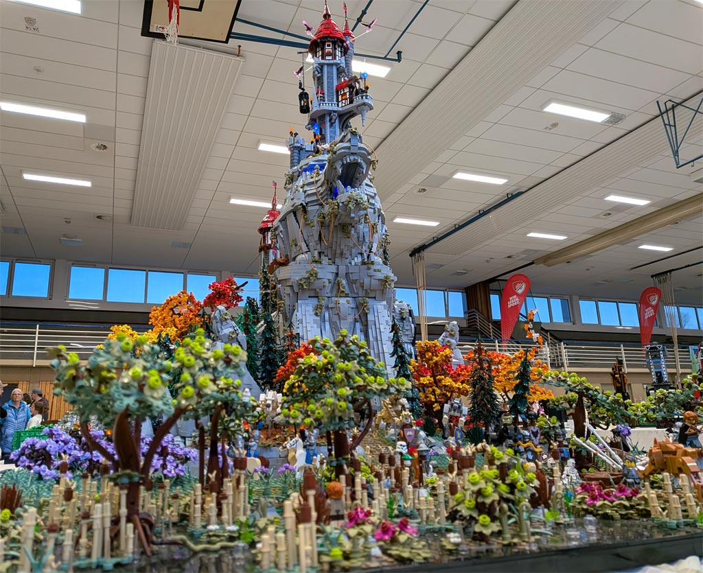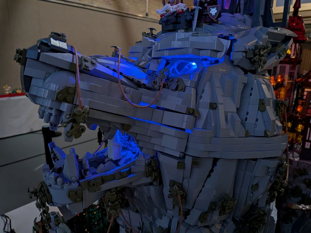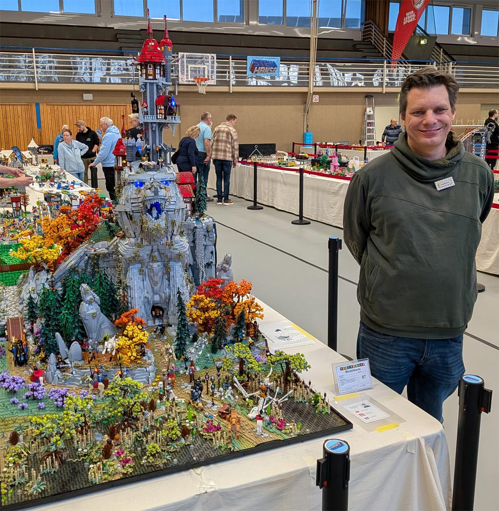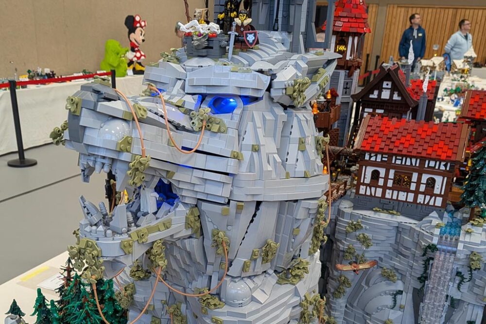 Alles hat begonnen mit der Darstellung des Wolfkopfes, der die Formen des Tieres nachzeichnet, aber obendrein wie ein Berg anmuten soll: Ein Ansinnen, das perfekt umgesetzt wurde. Der Maßstab war geboren, und die weiteren detaillierten Inhalte wie etwa das kleine Mittelalterdorf und das Waldstück wurden erschaffen. Grandios zu sehen ist, wie viel hier bei diesem Modell in Bewegung ist 📺. Ein wenig anwachsen soll das Modell noch, doch mehr sei nicht drin, denn die Fläche in seinem PKW sei endlich. Einmal soll das Modell – das zudem um ein Modul eines Baufreundes ergänzt wird – noch gezeigt werden, und zwar auf der diesjährigen Bricking Bavaria. Somit steht fest: Ein großes Wolfsgeheul gibt es auch im Süden!